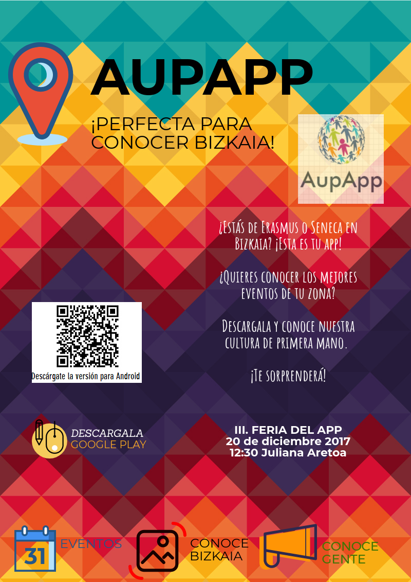 Aupapp es una aplicación dirigida a jóvenes estudiantes de programas de intercambio como Erasmus o Seneca que quieran aprender a moverse en Bizkaia y tener su primer contacto con el euskera. Es una aplicación estupenda para conocer gente y relacionarse tanto con personas de la zona como con otros y otras de Erasmus y Seneca, además de conocer la cultura vasca de primera mano. Los dispositivos en los que se podrá utilizar serán smartphone y tablet. Las lenguas en las que se articula la aplicación serán las siguientes: inglés, francés y español.