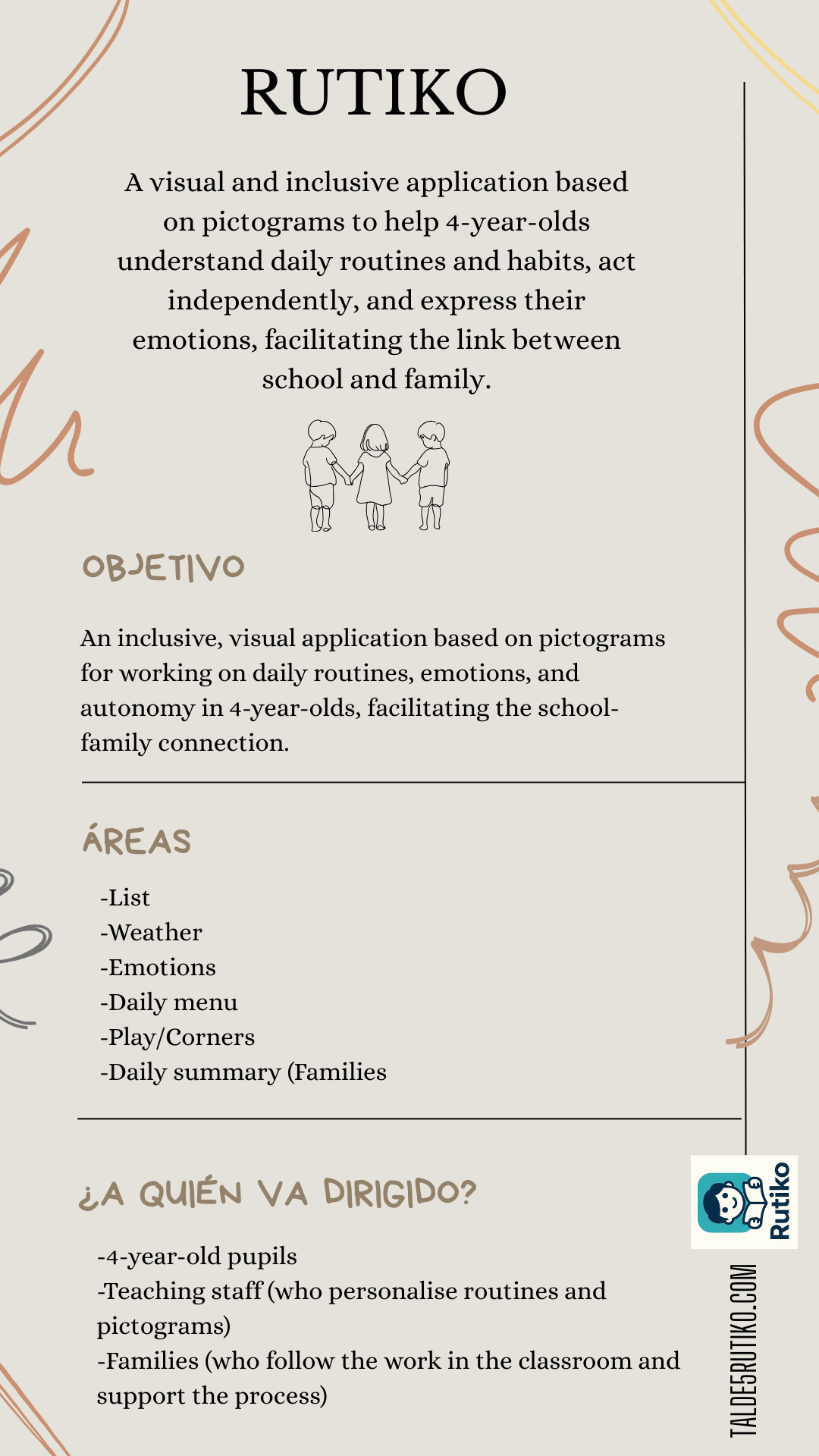 RUTIKO is an inclusive, visual app divided into two sections: one for pupils and one for teachers. The pupil section uses pictograms to help four-year-olds understand and anticipate daily routines, express emotions, view the menu and record attendance. The teacher section allows you to customise routines, adapt pictograms, review emotions and consult daily summaries. The app facilitates children's autonomy and improves communication between school and family. The main objective is to promote autonomy, understanding of routines, emotional expression and school-family communication through an inclusive and accessible digital tool. Main functions for students: